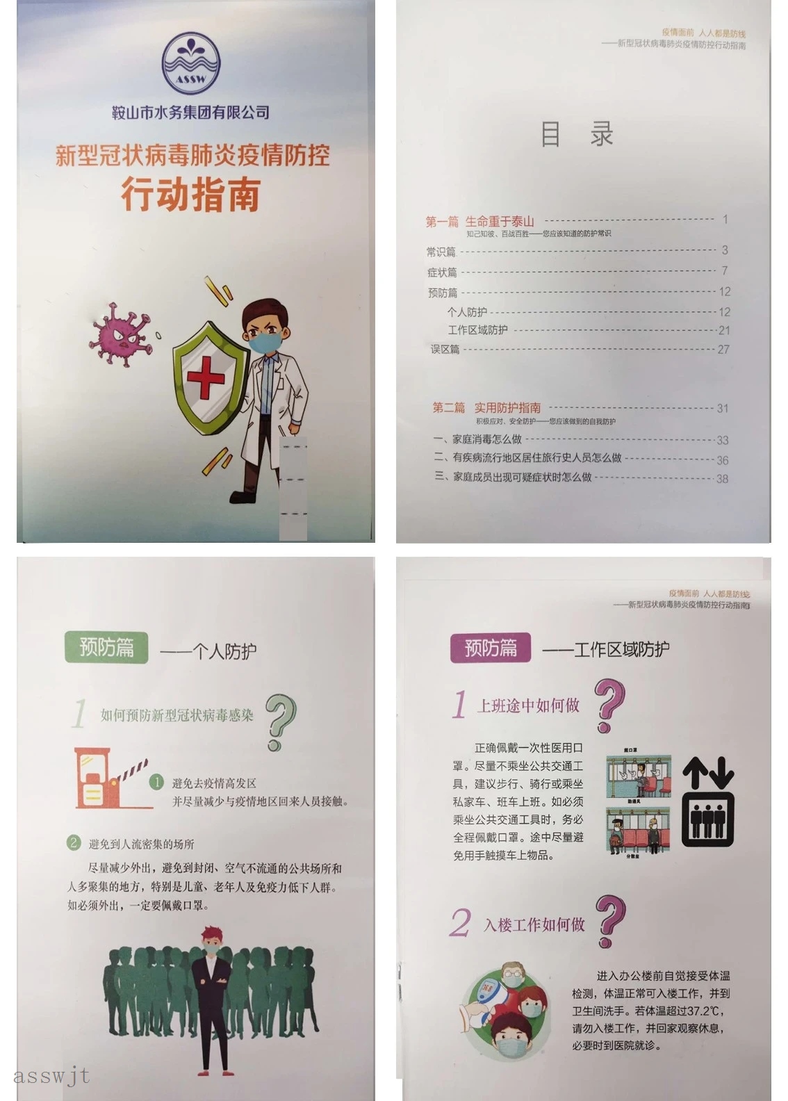 為加大疫情防控宣傳力度,強化職工疫情防控意識,助力鞍山企業(yè)穩定復產(chǎn),水務(wù)集團特編印“新型冠狀病毒肺炎疫情防控行動(dòng)指南”,真正做到水務(wù)職工人手一本,防疫知識隨時(shí)可查。