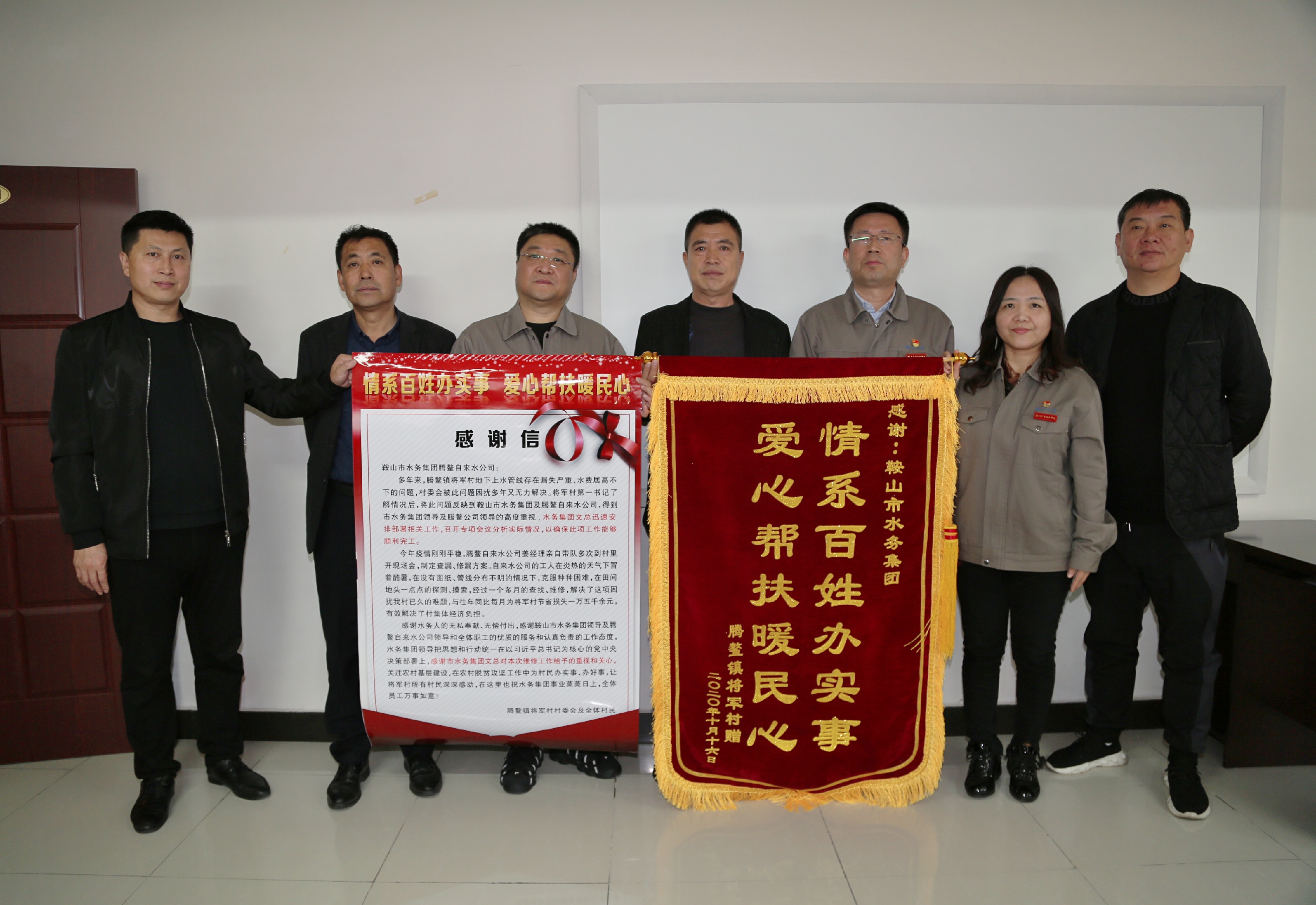 11月6日上午,騰鰲鎮將軍村黨委、村委兩委班子成員代表全體村民將一面印有“情系百姓辦實(shí)事,愛(ài)心幫扶暖民心”的錦旗和感謝信送到水務(wù)集團領(lǐng)導及工作人員手中,對水務(wù)集團為村民辦實(shí)事、辦好事表示衷心感謝。