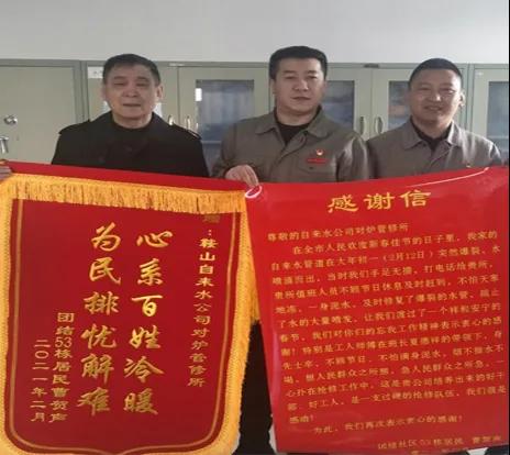 春節期間,水務(wù)集團鐵東自來(lái)水公司收到團結街53甲一樓便民店用戶(hù)送來(lái)的一面錦旗及一封感謝信。大年初一,對爐管修所值班人員接到團結街53甲一樓便民店報修,家里立杠突然爆裂。值班人員第一時(shí)間到達現場(chǎng),及時(shí)關(guān)閉水門(mén)止水。雖然團結街53棟為棄管樓,不歸所里維修,但為了保障春節期間百姓用水,在維修班長(cháng)的帶領(lǐng)下,經(jīng)過(guò)一個(gè)多小時(shí)的辛苦搶修,終于將漏水修復并及時(shí)恢復了供水。該用戶(hù)對集團快速及時(shí)的維修、熱情周到的優(yōu)質(zhì)服務(wù)給予高度贊揚!為表感謝,用戶(hù)特別制作了錦旗及感謝信,感謝鐵東自來(lái)水公司對爐管修所心系百姓,為民解憂(yōu)!