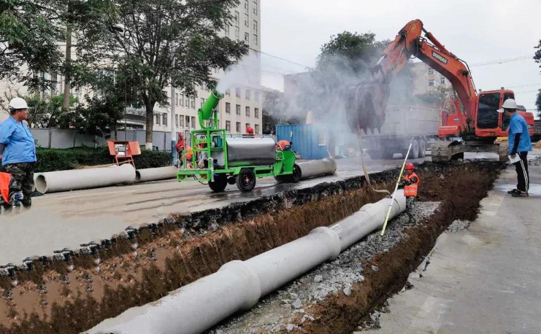 該地區局部管段建設年代早,管線(xiàn)老化,地下管網(wǎng)復雜,障礙多,施工難度大。為減少對城市交通和百姓生活的影響,排水公司按照集團城市精細化管理要求,積極落實(shí)施工方案,采取分段施工,嚴格施工工序,加強現場(chǎng)文明安全施工管理。施工過(guò)程中,細化措施,強化施工現場(chǎng)安全管控,在施工現場(chǎng)設置整齊統一的安全圍擋、公告板、安全警示帶及交通引導警示標識等,采取噴霧系統定時(shí)噴淋、霧炮和灑水降塵、挖掘殘土及時(shí)文明安全清運等舉措,做好揚塵降噪處理。