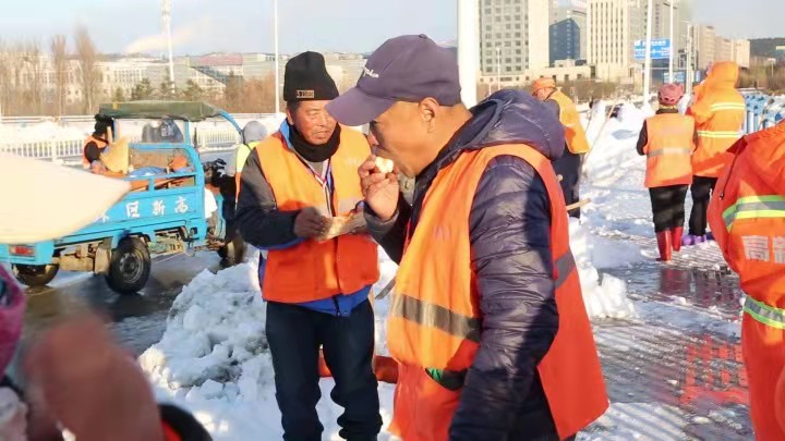 面對鞍山地區的歷史罕見(jiàn)特大暴雪,全市環(huán)衛工人為保證城市道路車(chē)輛和行人出行及時(shí)暢通,不畏嚴寒、日夜奮戰、堅守崗位,奮戰在除雪一線(xiàn)??吹揭恢痹诒┲袌允貚徫坏沫h(huán)衛工人,水務(wù)集團工作人員趕到各個(gè)掃雪點(diǎn),將慰問(wèn)品送給環(huán)衛工人。環(huán)衛工人吃著(zhù)熱乎乎的茶蛋,喝著(zhù)熱騰騰的豆漿,非常感動(dòng)。集團的慰問(wèn)讓環(huán)衛工人感受到了溫暖,同時(shí)傳遞了愛(ài)心,為助力城市除雪工作貢獻了水務(wù)力量。