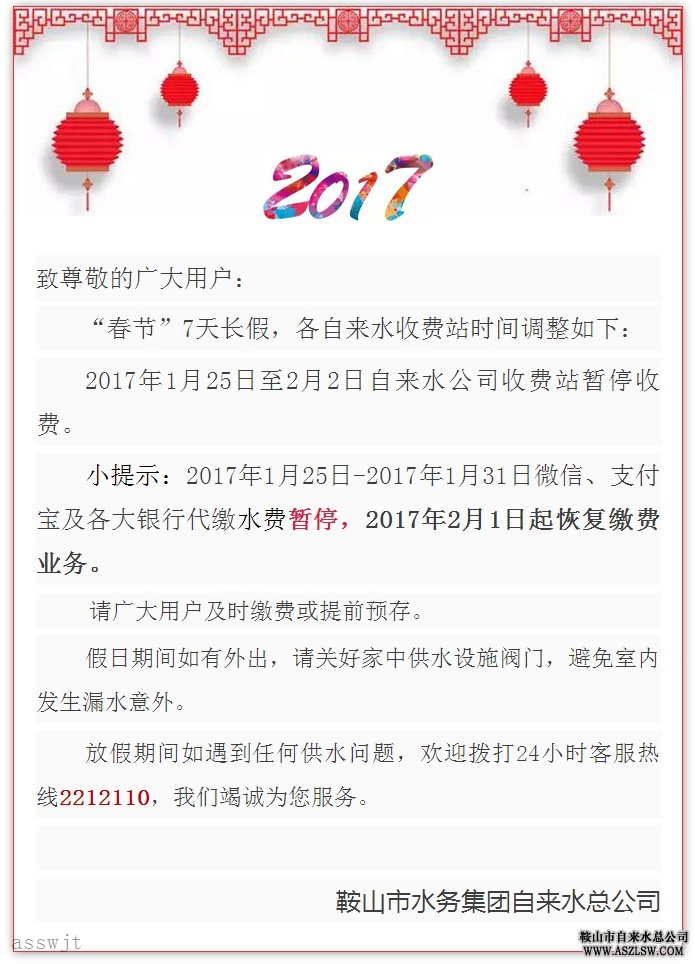 鞍山市水務(wù)集團祝大家新春快樂(lè ) 萬(wàn)事如意!