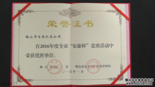 近日,在市總工會(huì )、市安監局聯(lián)合舉辦的2016年度鞍山市“安康杯”競賽活動(dòng)中,水務(wù)集團自來(lái)水總公司榮獲“優(yōu)勝單位”榮譽(yù)稱(chēng)號。