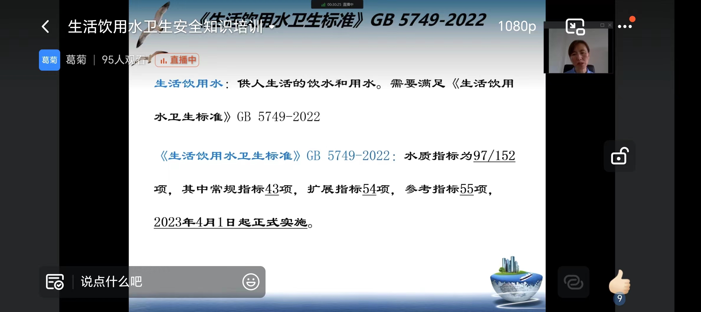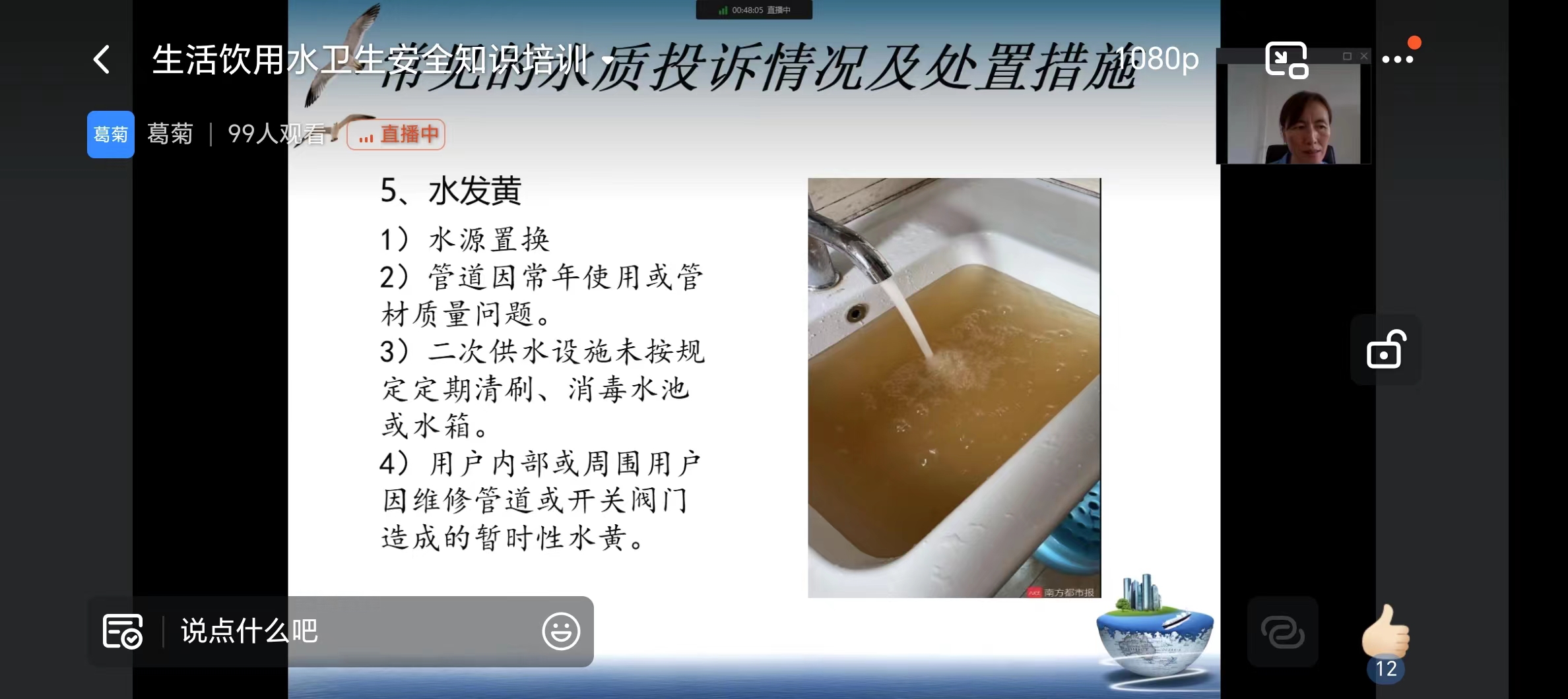 此次培訓由集團內訓師、水質(zhì)檢測中心有限公司副主任葛菊擔任講師。主要圍繞新修訂的《生活飲用水衛生標準》(GB 5749-2022)進(jìn)行了講解,對鞍山地區供水及水質(zhì)情況進(jìn)行概括以及對常見(jiàn)的水質(zhì)投訴情況及處置措施進(jìn)行了總結。通過(guò)列舉全國發(fā)生過(guò)的重大水質(zhì)污染典型事件,讓大家深刻認識到保障生活飲用水衛生安全的重要性。通過(guò)此次培訓,使供水系統一線(xiàn)崗位人員對水質(zhì)安全的知識又有了新的擴展,為大家在今后工作中以更加專(zhuān)業(yè)的知識為客戶(hù)提供優(yōu)質(zhì)服務(wù)打下了堅實(shí)基礎。