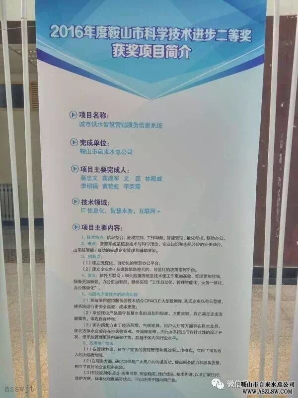 鞍山市水務(wù)集團《城市供水智慧營(yíng)銷(xiāo)服務(wù)信息系統》榮獲2016年度鞍山市科學(xué)技術(shù)進(jìn)步二等獎