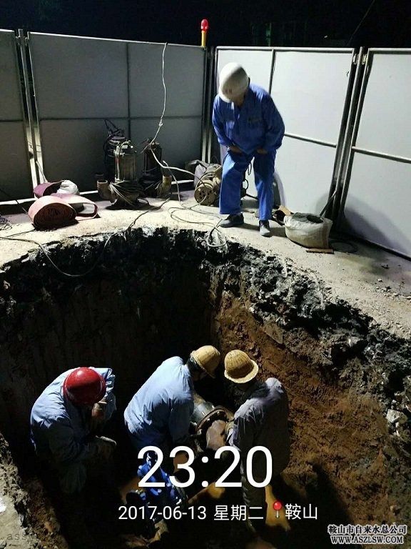 由于該路段道路狹窄,公交車(chē)流量大,工程開(kāi)工以來(lái),只能夜間9:30以后等最后一班公交車(chē)回庫后才能挖掘溝槽施工,給施工帶來(lái)一定困難,減慢了施工進(jìn)度。6月13日夜間22點(diǎn),工程進(jìn)入接點(diǎn)作業(yè)階段。施工現場(chǎng)為三個(gè)工作坑:DN300×300兩個(gè)、DN300×200一個(gè),需要新安裝一組DN200閥門(mén)。凌晨3點(diǎn)45分左右,現場(chǎng)接點(diǎn)完成后,進(jìn)行管道沖洗,沖洗合格后對現場(chǎng)進(jìn)行清掃。