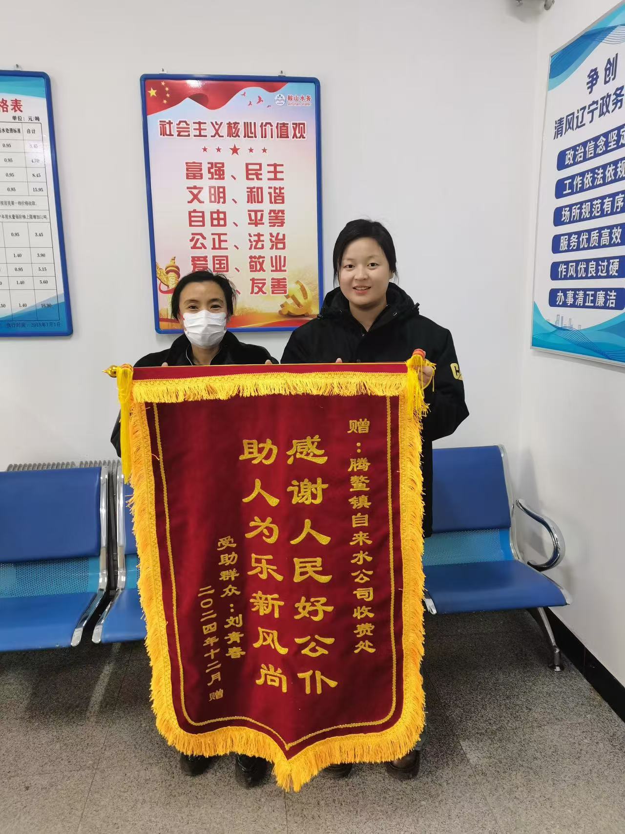 次日,滿(mǎn)懷感激的劉先生再次來(lái)到了水務(wù)收費站,將清洗干凈的棉衣歸還,還特意準備了一袋新鮮水果,表達對水務(wù)工作人員無(wú)私幫助的深深謝意。對于劉先生遞上來(lái)的水果,工作人員堅持婉拒,他們表示,“讓政府放心,讓用戶(hù)滿(mǎn)意”,不僅是水務(wù)集團對于供水服務(wù)工作的不變宗旨,也是集團為百姓積極排憂(yōu)解難的不變宗旨,對于劉先生當天遇到的困難,每一名水務(wù)人都會(huì )伸以援助之手。劉先生深受感動(dòng),為對水務(wù)集團的助人精神點(diǎn)贊,幾日后,特地制作了錦旗送到水務(wù)集團騰鰲公司收費站以表感激之情。