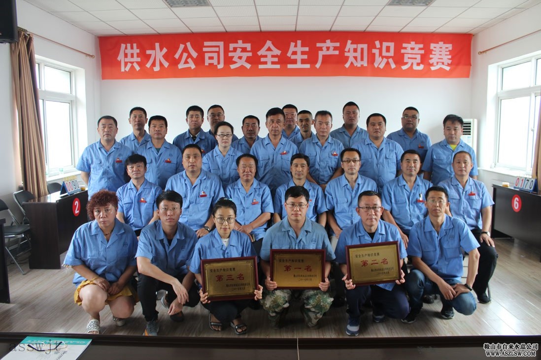 供水公司汪家峪凈水廠(chǎng)、老虎山凈水廠(chǎng)、北部水廠(chǎng)、西部水廠(chǎng)、中部水廠(chǎng)、水源泵站、機修廠(chǎng)7家基層單位參加競賽。參賽人員由廠(chǎng)長(cháng)、安全員和生產(chǎn)骨干組成。競賽分為個(gè)人必答題、集體必答題、搶答題、風(fēng)險題四個(gè)環(huán)節。知識競賽現場(chǎng)氣氛熱烈、答題踴躍。經(jīng)過(guò)激烈、緊張的角逐。最終,機修廠(chǎng)榮獲第一名,西部水廠(chǎng)獲得第二名,老虎山水廠(chǎng)獲得第三名,其余水廠(chǎng)獲得紀念獎。與會(huì )領(lǐng)導為獲獎代表隊頒發(fā)了獎品,并與全體參賽隊員合影留念。