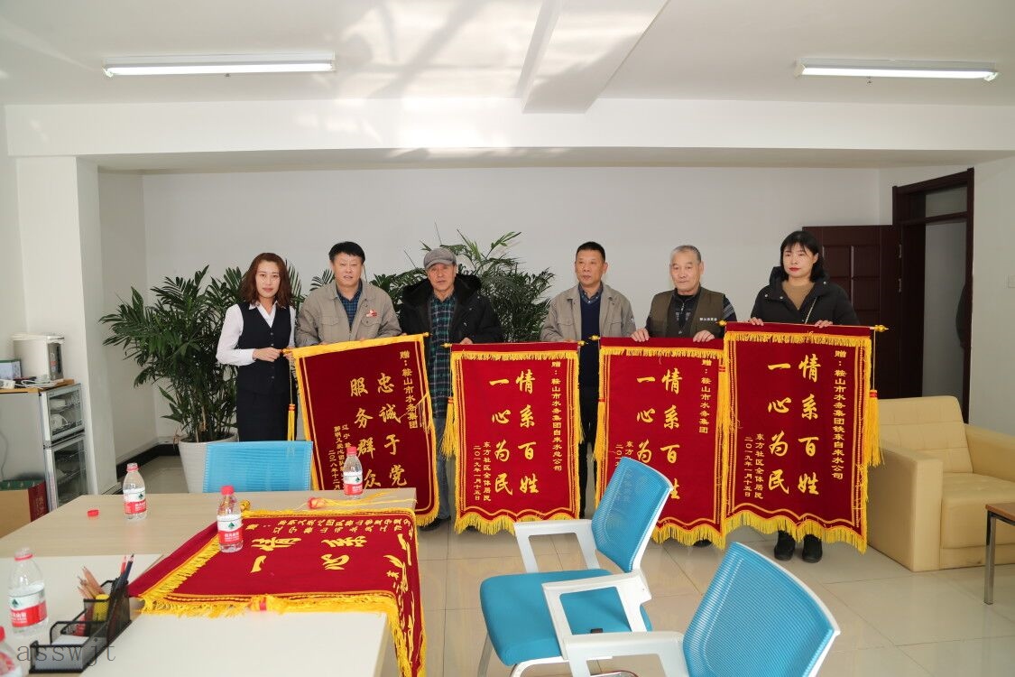 1月30日,鐵東區和平街道東方社區、鞍山市志愿服務(wù)協(xié)會(huì )鄰里守望總隊、遼寧鞍山馮永慶工作室代表,先后將5面寫(xiě)著(zhù)“情系百姓、一心為民”,“忠誠于黨、服務(wù)百姓”等字樣的錦旗,專(zhuān)程送到水務(wù)集團,以感謝排水事業(yè)總公司和鐵東自來(lái)水公司在義務(wù)疏通劇北巷返臟的下水井工作中付出的辛勤汗水。水務(wù)集團黨委書(shū)記裴忠文和籌備組成員李紹福熱情接待代表們并親切交談,同時(shí)感謝大家對水務(wù)集團服務(wù)工作的理解與支持,承諾將繼續發(fā)揚“辛苦我一個(gè)、方便千萬(wàn)家”的行業(yè)精神,更好地為全市人民供好水、服好務(wù)。