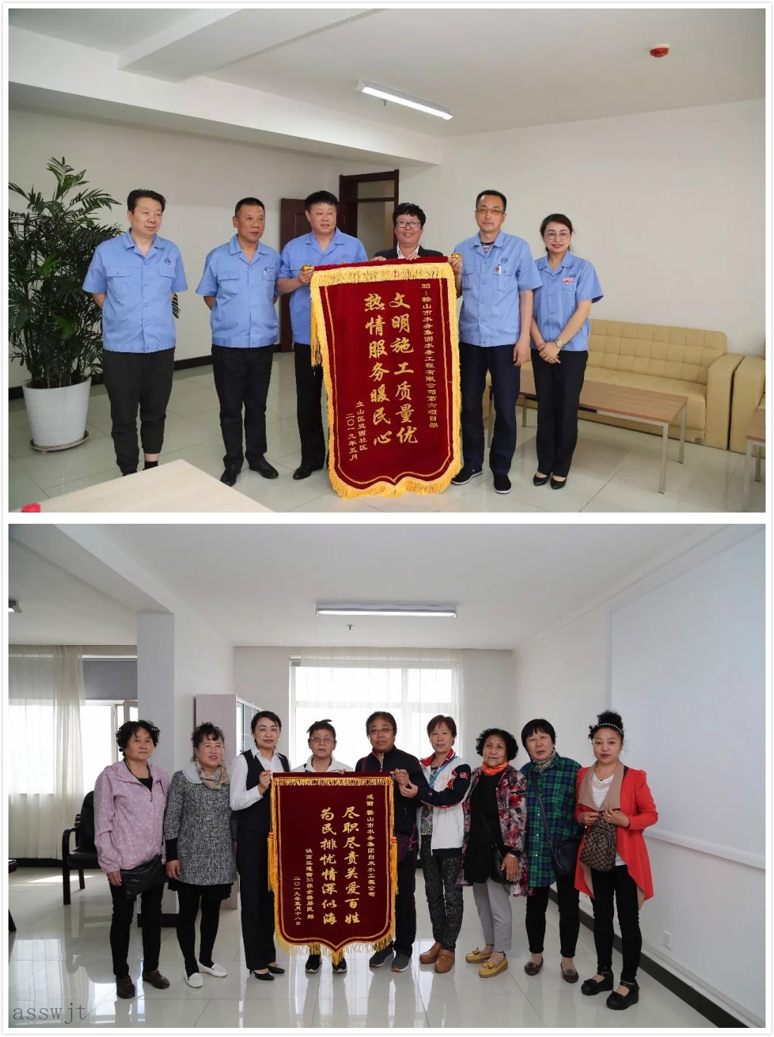 水務(wù)集團水務(wù)工程有限公司第六項目部在實(shí)施立山區靈山社區大修施工任務(wù)中秉承文明施工,服務(wù)為本的理念,施工人員犧牲午休就餐時(shí)間,加快施工進(jìn)度,縮短停水時(shí)間,對百姓提出的困難,盡全力解決,得到了百姓的一致好評。5月21日,社區劉主任代表全體百姓送來(lái)了錦旗表示感謝。
