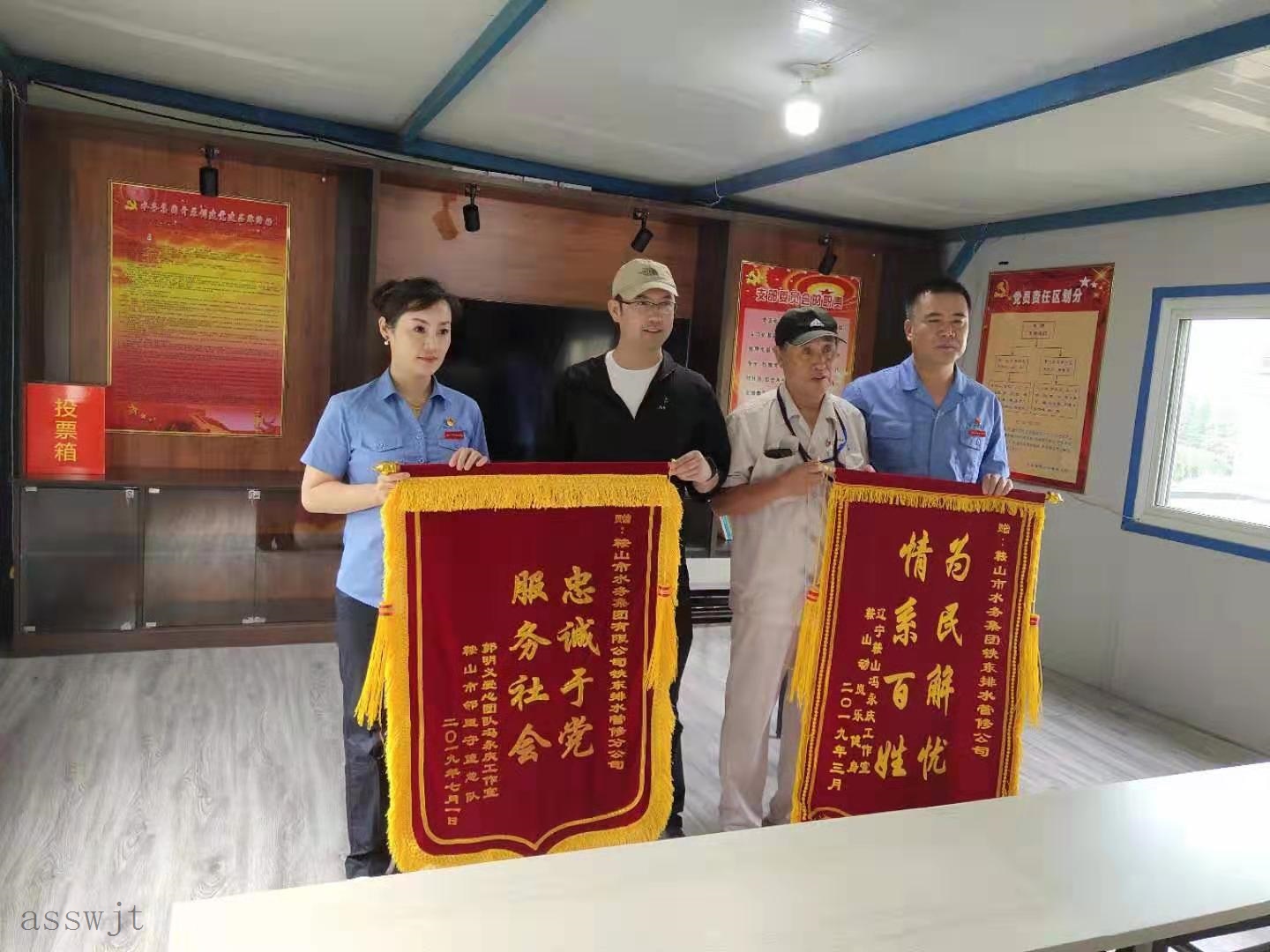 心系百姓,義務(wù)奉獻。近日,“鞍山好人”馮永慶與愛(ài)心團隊成員一同將兩面印有“忠誠于黨,服務(wù)社會(huì )” 、“為民解憂(yōu) 情系百姓”的錦旗送到水務(wù)集團排水有限責任公司鐵東管修分公司,對排水公司勇于承擔社會(huì )責任,堅持為百姓服務(wù)表示衷心的感謝。