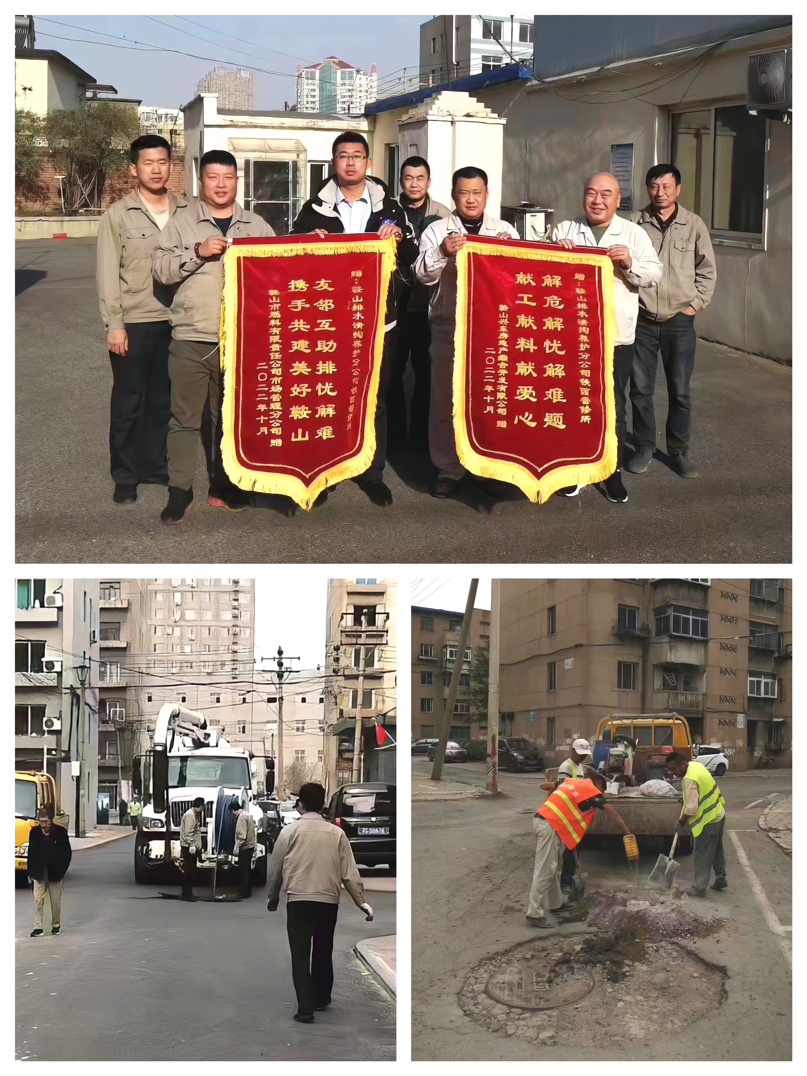鐵西三街口附近一居民樓前的排水檢查井出現堵塞現象,造成污水外溢,影響附近居民出行。興東房地產(chǎn)綜合開(kāi)發(fā)有限公司向集團求助。集團了解情況后,立即組織搶修人員趕赴現場(chǎng)勘察,在確定堵塞點(diǎn)后,利用專(zhuān)業(yè)疏通設備在堵點(diǎn)上下游反復沖刷疏通,成功解決淤堵問(wèn)題。鞍山市燃料有限責任公司市場(chǎng)管理分公司門(mén)前兩座檢查井由于管線(xiàn)老化,出現塌陷破損現象。集團接到報修電話(huà)后,迅速安排人員對破損檢查井進(jìn)行調平維修,及時(shí)消除路面塌陷帶來(lái)的安全隱患。