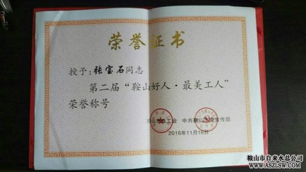 在市總工會(huì )、市委宣傳部共同開(kāi)展的第二屆“鞍山好人·最美工人”推選活動(dòng)中,供水公司汪家峪凈水廠(chǎng)送水班組大班長(cháng)、鞍山市勞動(dòng)模范張寶石同志榮獲“鞍山好人·最美工人”榮譽(yù)稱(chēng)號,并被市總工會(huì )授予鞍山市“五一勞動(dòng)獎?wù)隆薄?/span>