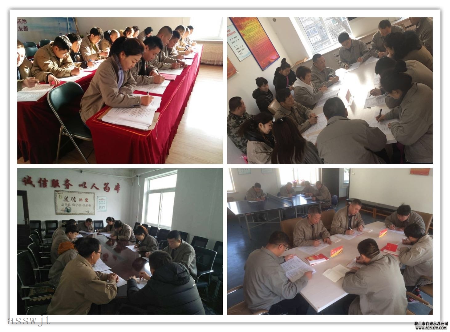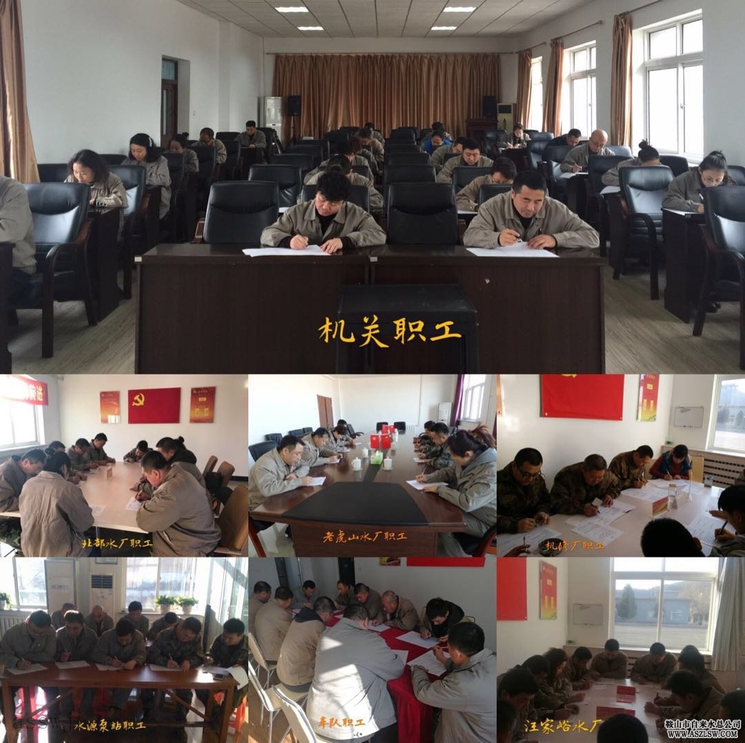 根據市委和市國資委黨委要求,從11月30日—12月8日,水務(wù)集團所屬各黨總支、支部分別組織全體黨員干部和職工2200余人進(jìn)行了學(xué)習宣傳貫徹黨的十九大精神知識考試??荚嚥捎瞄]卷的形式??紙?chǎng)上,職工們神情專(zhuān)注,根據平時(shí)掌握的十九大知識認真答題,并結合自己學(xué)習和工作實(shí)際闡述了學(xué)習黨的十九大精神體會(huì )。