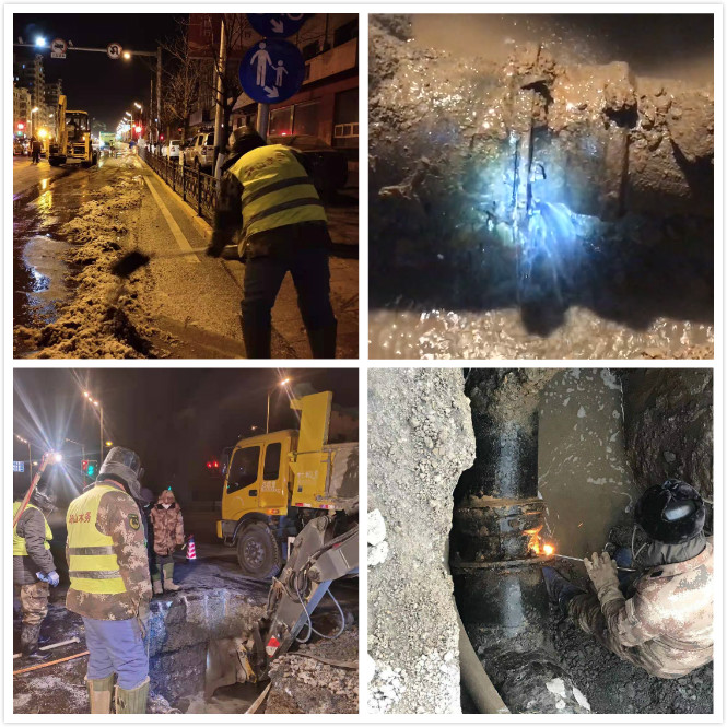 現場(chǎng)人員不畏嚴寒、爭分奪秒、徹夜奮戰,一邊搶修漏水管線(xiàn)一邊清除馬路冰水,經(jīng)過(guò)一夜的不懈努力,終于在次日5時(shí)恢復供水?;謴凸┧?,經(jīng)檢測又在南側一處老管線(xiàn)上出現漏點(diǎn),漏水就是命令,雖然身體已十分疲憊,但搶修人員心中只有一個(gè)信念,盡快完成搶修,確保百姓用水無(wú)憂(yōu),1月2日下午17時(shí)圓滿(mǎn)完成了第二次搶修任務(wù)。此次連續奮戰,水務(wù)集團工程公司出動(dòng)7臺工程搶修車(chē)輛20余名搶修人員,晝夜連續奮戰、克服嚴寒天氣,高質(zhì)量、高效率的完成了搶修任務(wù)。