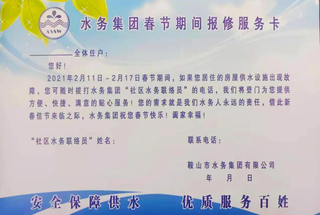 為確保廣大市民能夠度過(guò)一個(gè)平安、祥和的春節,自2021年2月4日開(kāi)始,水務(wù)集團在全市各居民樓或社區的公示欄上張貼了《水務(wù)集團春節期間報修服務(wù)卡》,將負責居民樓所在轄區的水務(wù)集團“社區水務(wù)聯(lián)絡(luò )員”電話(huà)進(jìn)行了公示,節日期間如家中供水設施突發(fā)故障,市民可隨時(shí)撥打電話(huà)報修,水務(wù)集團將及時(shí)提供方便、快捷、滿(mǎn)意的報修服務(wù),全力保障百姓春節期間用水無(wú)憂(yōu)。