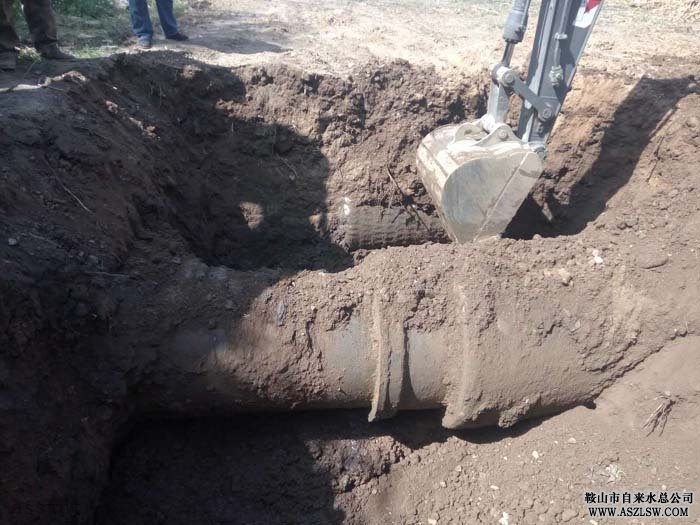 八時(shí)抵達現場(chǎng),挖掘工作開(kāi)始。作業(yè)面打開(kāi)后,發(fā)現漏水管線(xiàn)旁?xún)H一鏟距離還有管線(xiàn),近距離挖掘非??简灱夹g(shù)。挖到兩管接近管底處時(shí),班長(cháng)擔心繼續機械挖掘會(huì )觸碰另一側管線(xiàn),造成漏水,便下溝人工挖掘。此時(shí)室外溫度高,手動(dòng)挖掘作業(yè)強度大,搶修隊職工不顧汗水混著(zhù)泥水,迅速清淤,亮出漏水點(diǎn)。漏水點(diǎn)為鑄鐵管口漏,但距離漏水點(diǎn)僅不到一米處就是水泥管和鑄鐵管的交接處,這致使漏水點(diǎn)不能用哈夫節包住,只能加工DN1000mm轉換件。由于事先準備充分,清出漏點(diǎn)后將轉換件以打灰口方式固定住,經(jīng)過(guò)幾小時(shí)的連續工作,終于在下午一點(diǎn),將漏水順利堵住。