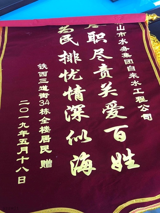 施工結束后,三道街34棟全體居民為水務(wù)工程有限公司送來(lái)一面寫(xiě)著(zhù)“盡職盡責關(guān)愛(ài)百姓,為民排憂(yōu)情深是?!钡拇蠹t錦旗。在今后的工作中,水務(wù)工程有限公司全體職工會(huì )再接再厲,繼續秉承“辛苦我一個(gè),方便千萬(wàn)人”的服務(wù)理念,進(jìn)一步提高服務(wù)質(zhì)量和服務(wù)水平,樹(shù)立供水人良好的服務(wù)形象。