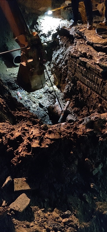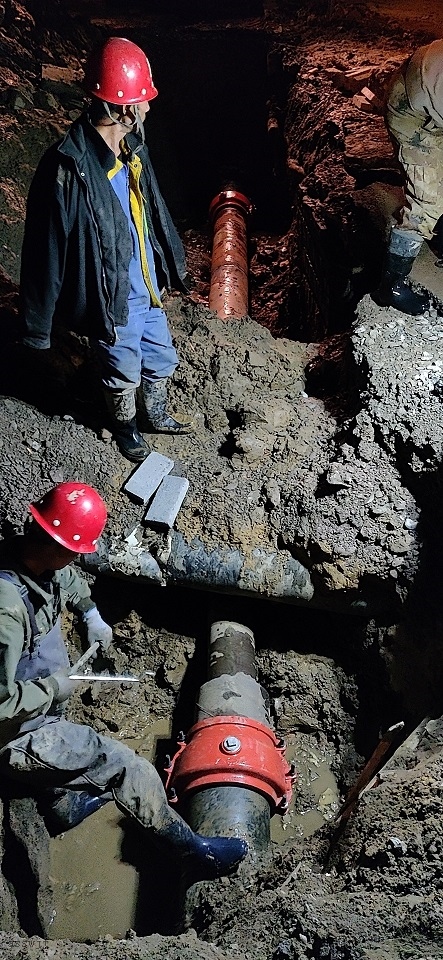 到達現場(chǎng)后將現場(chǎng)用護欄板圍住后開(kāi)始挖掘,挖到漏水點(diǎn)發(fā)現,我們的DN300管線(xiàn)是被供暖管線(xiàn)壓斷,斷裂的非常長(cháng),這使維修難度大大提升,哈弗節無(wú)法包住漏水。隊長(cháng)宋陽(yáng)立即放棄原定哈夫節修理的辦法,確定搶修方案為斷管更換整根新管。由于管件需要現場(chǎng)制作,也耗費了很長(cháng)時(shí)間,所有隊員在等待管件制作的過(guò)程中,進(jìn)行溝下的挖掘清理工作,管件到達現場(chǎng)后開(kāi)始焊接并且安裝,由于供暖管線(xiàn)處于DN300管線(xiàn)正上方而且離得特別近,我們只能采取避讓措施,用DN200套DN300管的方式完成了避讓?zhuān)瑑蓚冉涌谔幱霉蚬澾B接。