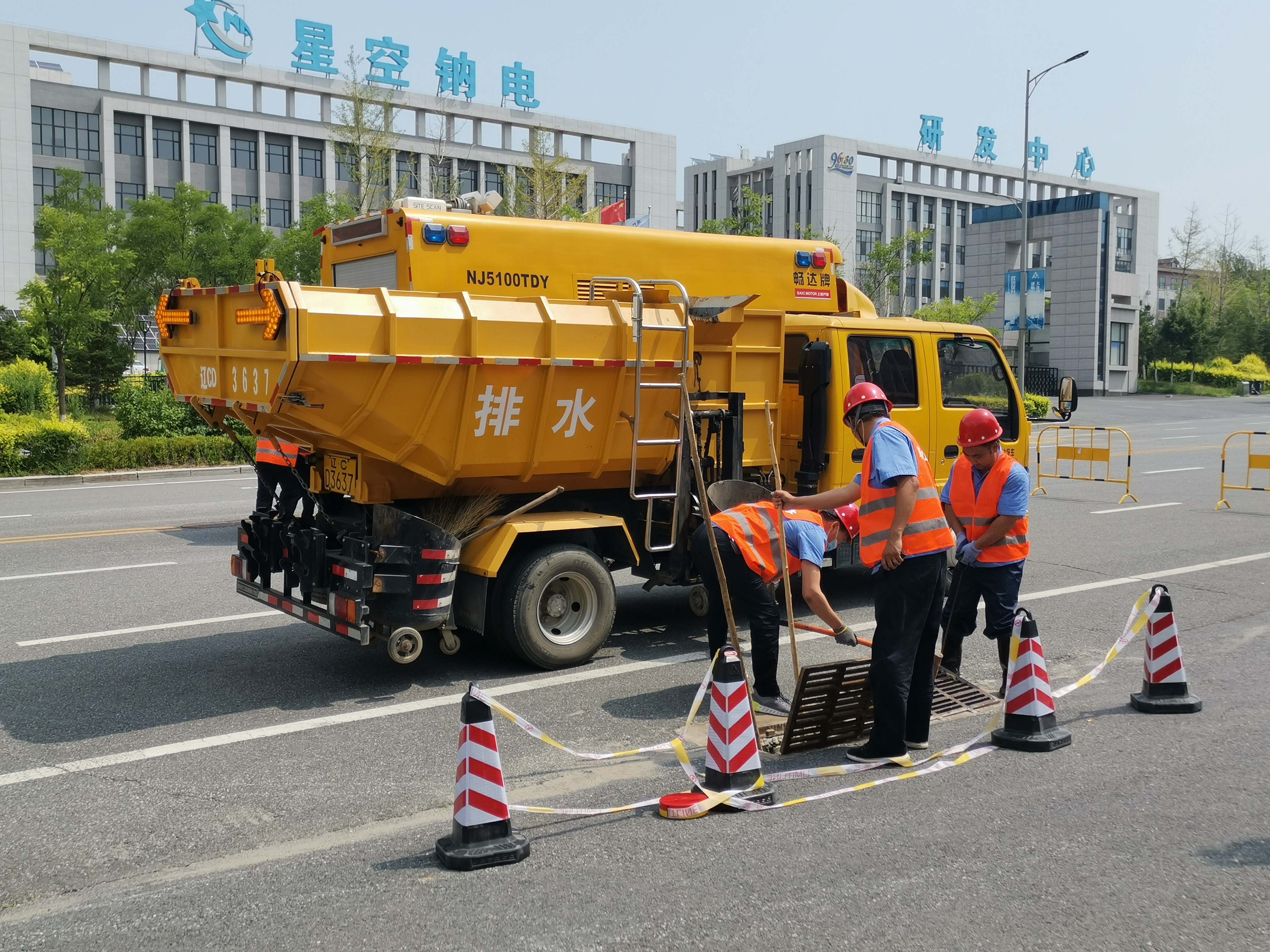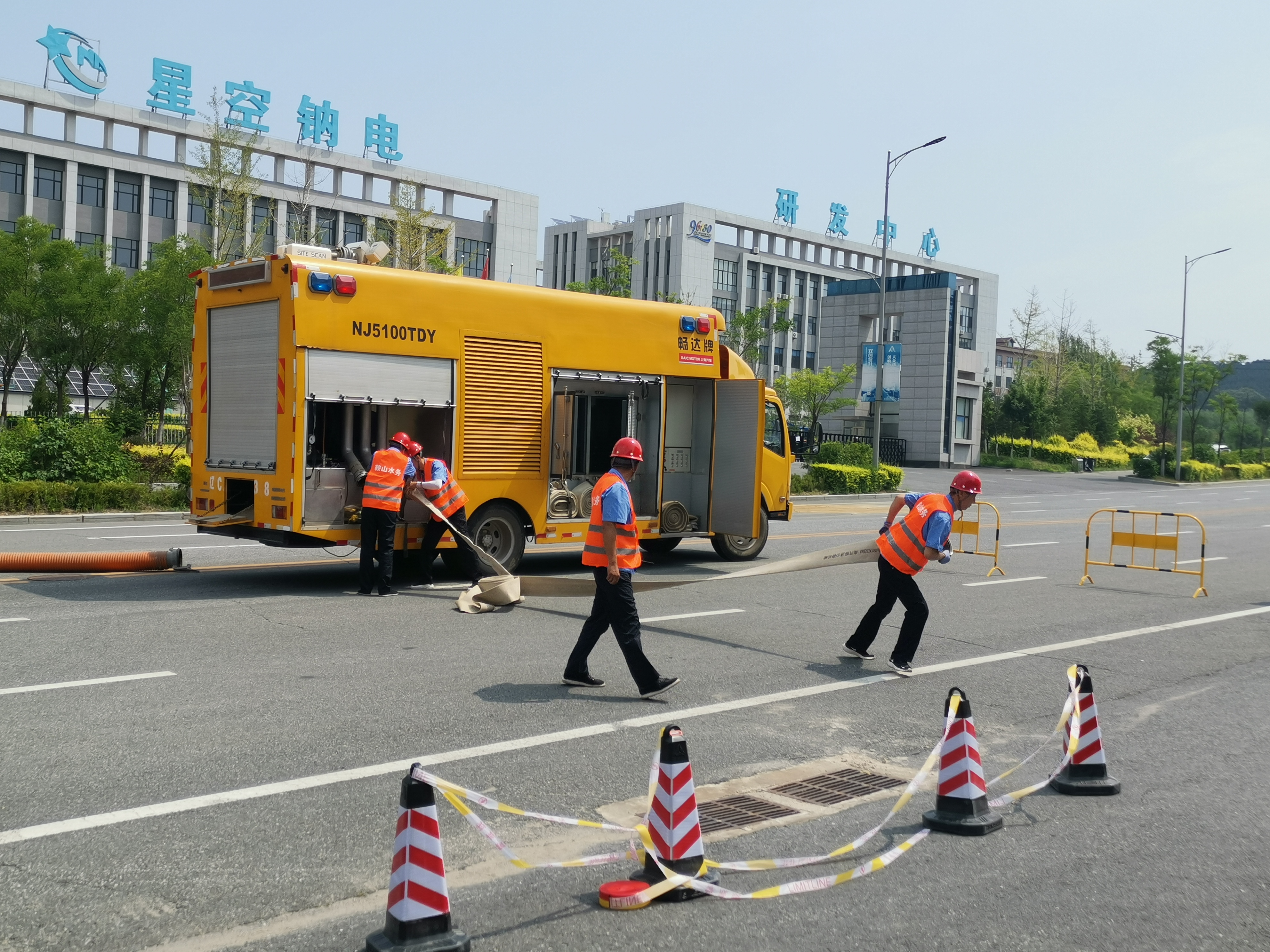在演練過(guò)程中,模擬了暴雨過(guò)后路面出現積水時(shí),現場(chǎng)負責人及時(shí)向指揮中心報告,立即啟動(dòng)防汛應急預案,抗洪搶險車(chē)隊迅速到達指定地點(diǎn),按照分工到達各自點(diǎn)位進(jìn)行搶險,擺放安全欄,兩名防汛人員用專(zhuān)用工具打開(kāi)雨水井蓋,采用人機配合的方式,大型移動(dòng)泵車(chē)先進(jìn)行抽水作業(yè),清掏人員進(jìn)行管線(xiàn)清淤,發(fā)現聯(lián)絡(luò )管淤堵,防汛人員啟動(dòng)高壓射水管線(xiàn)疏通車(chē)對淤堵部位再次疏通,展示應急強排能力,用時(shí)2分鐘完成疏通,最后吸污車(chē)進(jìn)行現場(chǎng)污物清理。