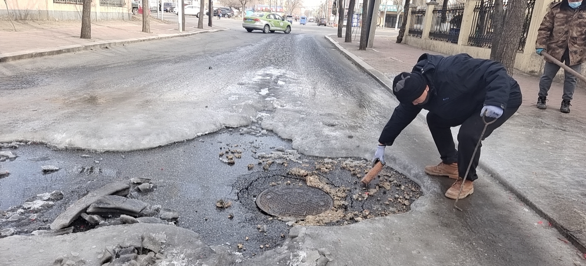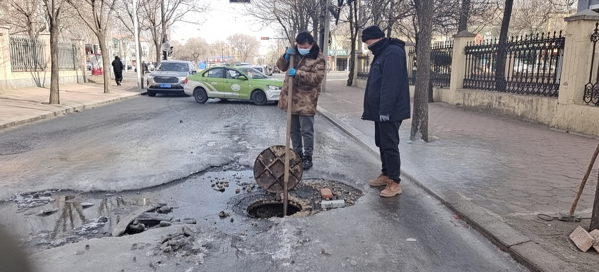 1月21日,農歷大年三十,站南街建設大道往南,一檢查井出現污水外溢情況。清掏養護維修分公司立山管修所接到報票后,迅速組織冬季服務(wù)搶修人員調集車(chē)輛奔赴現場(chǎng),經(jīng)現場(chǎng)勘查,由于附近飯店違規接點(diǎn),長(cháng)期傾倒油污垃圾,導致管線(xiàn)堵塞無(wú)法正常排水。為了不影響來(lái)往車(chē)輛正常通行,搶修人員決定采用人工疏通方式進(jìn)行清掏作業(yè)。大家輪番上陣,克服冬季天氣寒冷,用竹批子深入井內反復拉拽對堵塞管線(xiàn)進(jìn)行疏通,經(jīng)過(guò)搶修人員1個(gè)小時(shí)的共同努力,成功疏通堵塞管道,保障了節日期間轄區居民安全出行。
