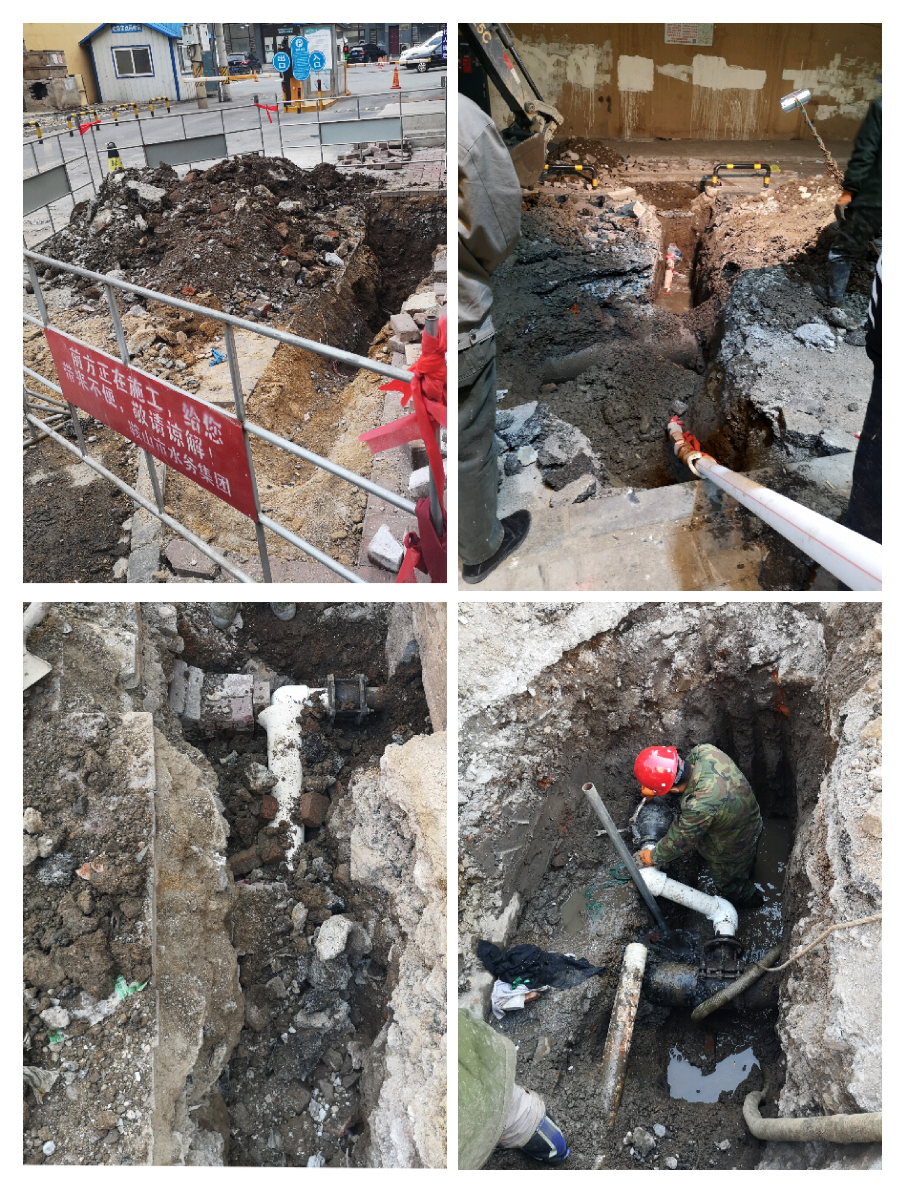為從根本上解決該處漏水,鐵西公司領(lǐng)導、查漏隊、工程技術(shù)室共同研究下決定廢除該DN100管線(xiàn)。由于施工路段在婦兒醫院北門(mén),白天人流車(chē)流量大,為避免施工造成交通擁堵,影響救護車(chē)出行,多次在夜間進(jìn)行施工、人工挖掘。在北陶所與搶修隊全力配合下,克服諸多困難,完成DN200管線(xiàn)接點(diǎn)三處、掐點(diǎn)1處,廢除DN100管線(xiàn)200多米,經(jīng)過(guò)五天的緊張施工,終于在415日徹底解決了該處漏水,通過(guò)區域計量表前后數據對比,日減少漏水450立左右。