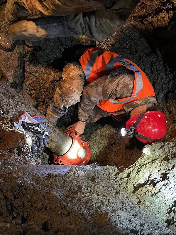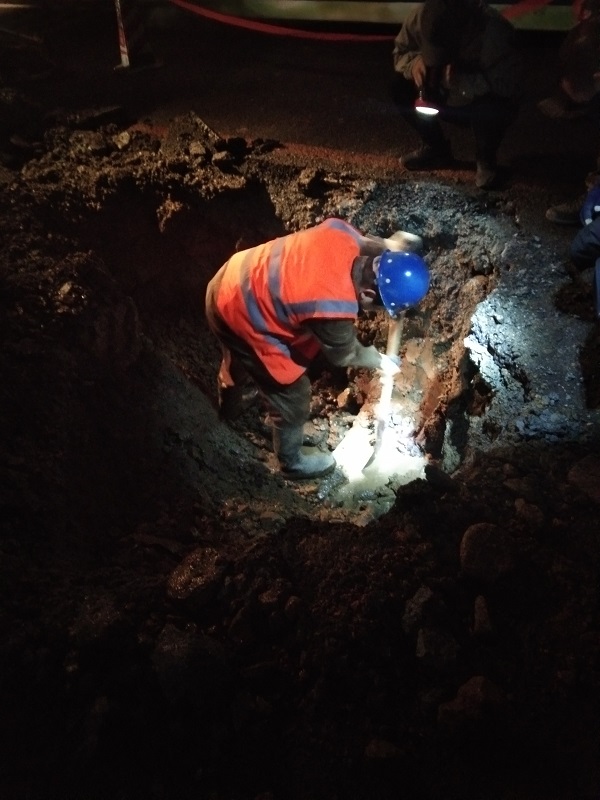 千山公司新?tīng)I所按照集團部署和千山公司每周降差計劃,每日安排專(zhuān)人查看分析水量,12月9日,通過(guò)水量系統發(fā)現八大局區域日供水量突增約200立,所內立即組織人員對八大局區域的供暖戶(hù)和企業(yè)戶(hù)進(jìn)行用水觀(guān)察,水量對比分析,同時(shí)組織維修工對該區域管線(xiàn)井室進(jìn)行地毯式排查,經(jīng)過(guò)排查,供暖和企業(yè)用水正常,區域內也未發(fā)現明顯漏水,所內立即制定查漏方案,按照管網(wǎng)供水走向進(jìn)行分段測試查找,在千山公司技術(shù)室的幫助下,通過(guò)分段閉門(mén)測試,最后確定漏水區域為師范學(xué)院東平安街67附近DN200主線(xiàn)和DN150支線(xiàn),工程室主任立即幫助聯(lián)系集團查漏隊幫助定點(diǎn),同時(shí)聯(lián)系搶修隊趕赴現場(chǎng)待命,查漏隊同志經(jīng)過(guò)一個(gè)半小時(shí)的緊張查找,最終確定漏點(diǎn)為DN150過(guò)道管漏水,經(jīng)挖掘為DN150過(guò)道管線(xiàn)橫向斷裂,搶修于晚18時(shí)30分結束。