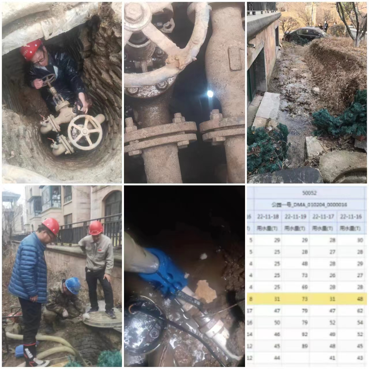 11月19號,新?tīng)I所通過(guò)計量管理系統發(fā)現公園一號小區水量突增40立,立即組織人員排查,經(jīng)排查發(fā)現該區域有路面滲水痕跡后立即上報工程技術(shù)室,工程技術(shù)室及時(shí)聯(lián)系集團查漏隊及搶修隊趕赴現場(chǎng),查漏隊第一時(shí)間排查漏水點(diǎn),最終發(fā)現供水井室內DN63地趟管彎頭斷裂導致漏水,由于管線(xiàn)在地下井里并且旁邊還緊挨著(zhù)供暖管線(xiàn),無(wú)法采取挖掘機工作,雖然人工挖掘非常困難,但為了止水,還是決定采取人工作業(yè)。維修人員克服搶修工作中艱難險阻,最終在新?tīng)I所維修班的共同努力下及千山公司搶修隊人員的協(xié)助下經(jīng)過(guò)長(cháng)達6個(gè)小時(shí)的艱苦作業(yè),終于將此處漏水修復好并恢復供水,日降低漏失水量1000余立。