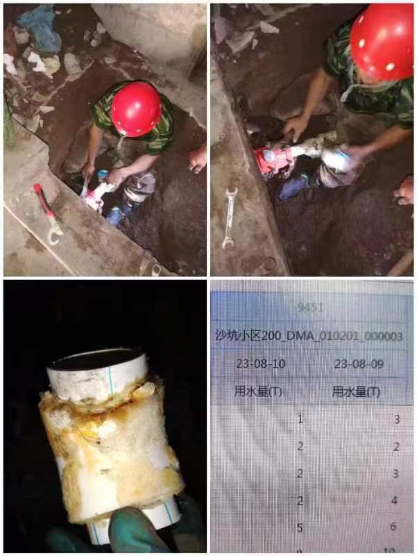 7月下旬,歷時(shí)14個(gè)高溫工作日,排查沙坑地區北大井1、北大井2、沙坑小房三處小房區域與18棟樓房進(jìn)戶(hù)線(xiàn)以及沙坑地區全部三井設施,通過(guò)對進(jìn)戶(hù)線(xiàn)聽(tīng)音和分段測流的方式,初步鎖定沙坑9棟存在漏水,后續通過(guò)社區工作人員的幫助,與沙坑9棟每單元一樓住戶(hù)全部取得了聯(lián)系,隨后對每單元一樓住戶(hù)家中總控制閥門(mén)進(jìn)行聽(tīng)音,經(jīng)反復對進(jìn)戶(hù)線(xiàn)聽(tīng)音及住戶(hù)閉門(mén)測試,最終鎖定93單元進(jìn)戶(hù)線(xiàn)存在漏水,為了更準確定位漏水點(diǎn)和減少對地面的破環(huán),我們采取對地面開(kāi)孔插探針的方式,鎖定漏水點(diǎn)進(jìn)行挖掘,發(fā)現該漏水為DN63進(jìn)戶(hù)管線(xiàn)45度彎頭接口處開(kāi)裂導致漏水產(chǎn)生。