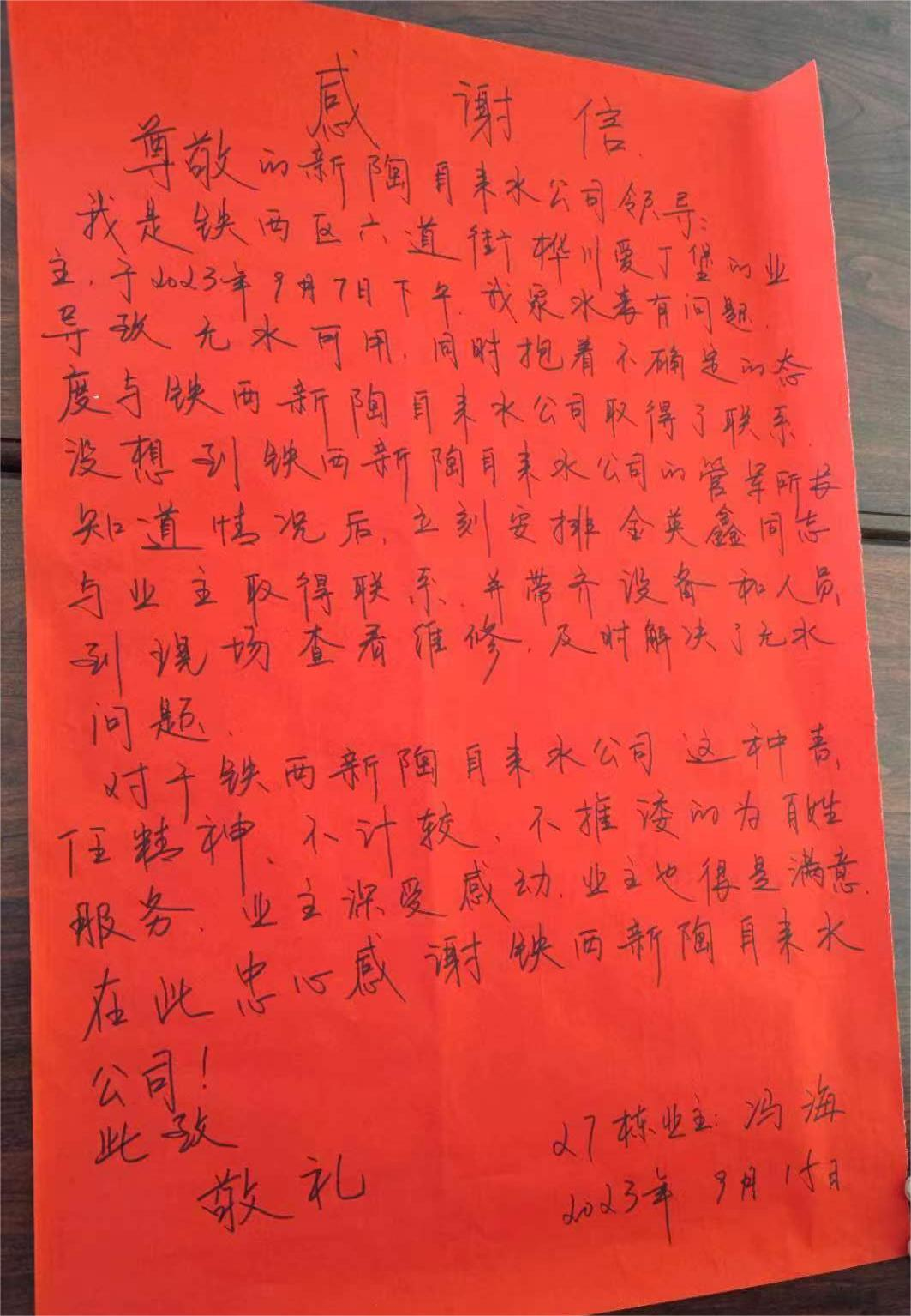 2023年9月15日,家住鐵西華川愛(ài)丁堡小區六道街381棟2單元13層的居民馮海先生將一封感謝信送到鐵西公司新陶管修所,感謝新陶所有作為、肯擔當,全心全意為百姓辦實(shí)事、解難題的工作作風(fēng)。