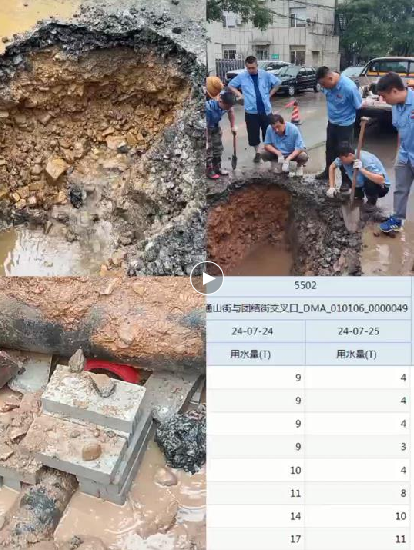 2024年7月23日,自由管修所通過(guò)每日日常水量巡檢,發(fā)現通山街團結街西側區域考核表數據存在異常,經(jīng)對比發(fā)現該區域水量偏高。由于水量突增較大,又正直連日發(fā)生強降雨天氣,給漏水查找工作帶來(lái)極大阻力。立山公司領(lǐng)導班子和技術(shù)室人員也多次冒雨到達現場(chǎng)指導工作,自由管修所不畏困難,冒雨連夜作戰,通過(guò)夜查閥門(mén)等方式,最終將漏水區域鎖定在通山街DN100主線(xiàn)。經(jīng)過(guò)探坑挖掘,管道聽(tīng)音,漏水儀使用,24下午,終于將漏水點(diǎn)挖出,漏水原因為燃氣施工改造時(shí)將其DN300主管線(xiàn)鋪設在自來(lái)水主管線(xiàn)下線(xiàn)DN100管上,填埋后燃氣管線(xiàn)下沉后導致DN100管線(xiàn)斷裂漏水。經(jīng)維修班維修后,該區域日降低無(wú)效水量約144立。