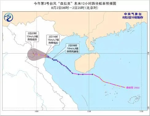 “森拉克”:南海熱帶低壓于8月1日下午2點(diǎn)加強為今年第3號臺風(fēng)“森拉克”(熱帶風(fēng)暴級)(英文名稱(chēng):Sinlaku;名字來(lái)源:密克羅尼西亞;名字意義:傳說(shuō)中的女神),并于下午3點(diǎn)前后掠過(guò)海南省三亞市南部海面,下午5點(diǎn)其中心已移入北部灣海面,中心位于海南省東方市南偏西方大約100公里的海面上,北緯18.2度、東經(jīng)108.4度,中心附近最大風(fēng)力8級(18米每秒),中心最低氣壓992百帕。